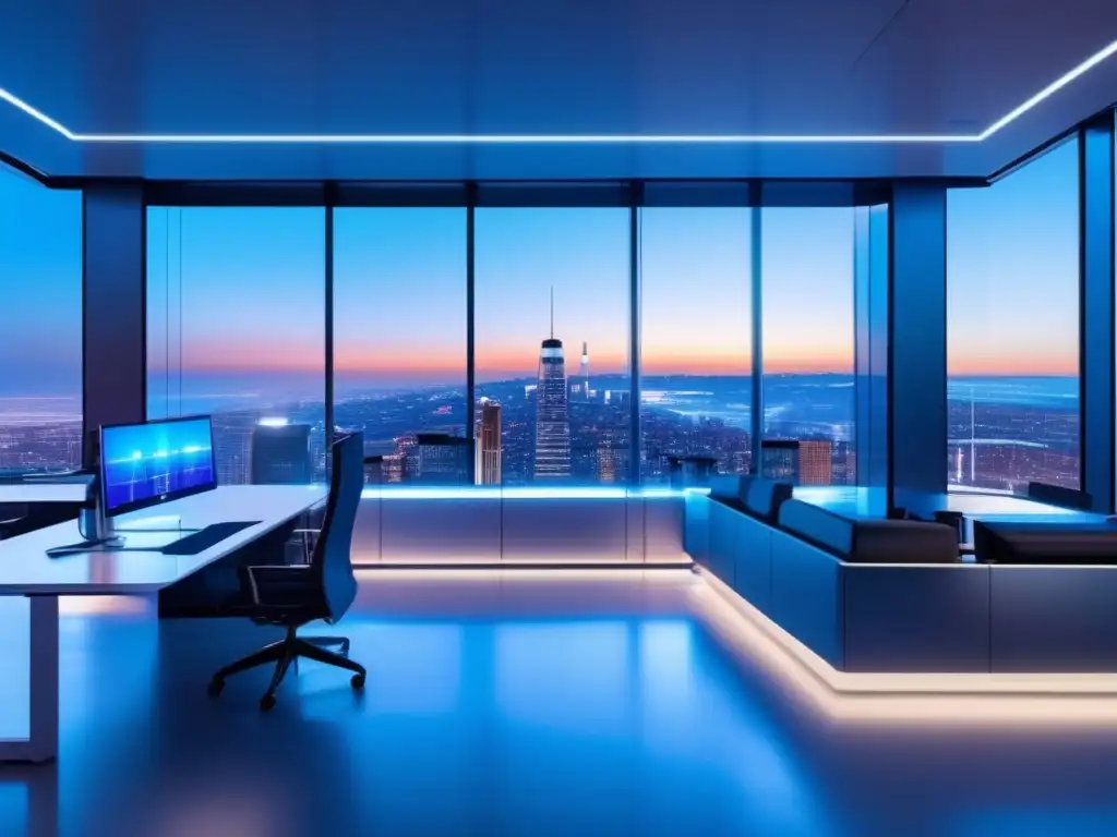 En una oficina futurista con vista nocturna a la ciudad, profesionales discuten desafíos legales en plataformas de transferencias cripto