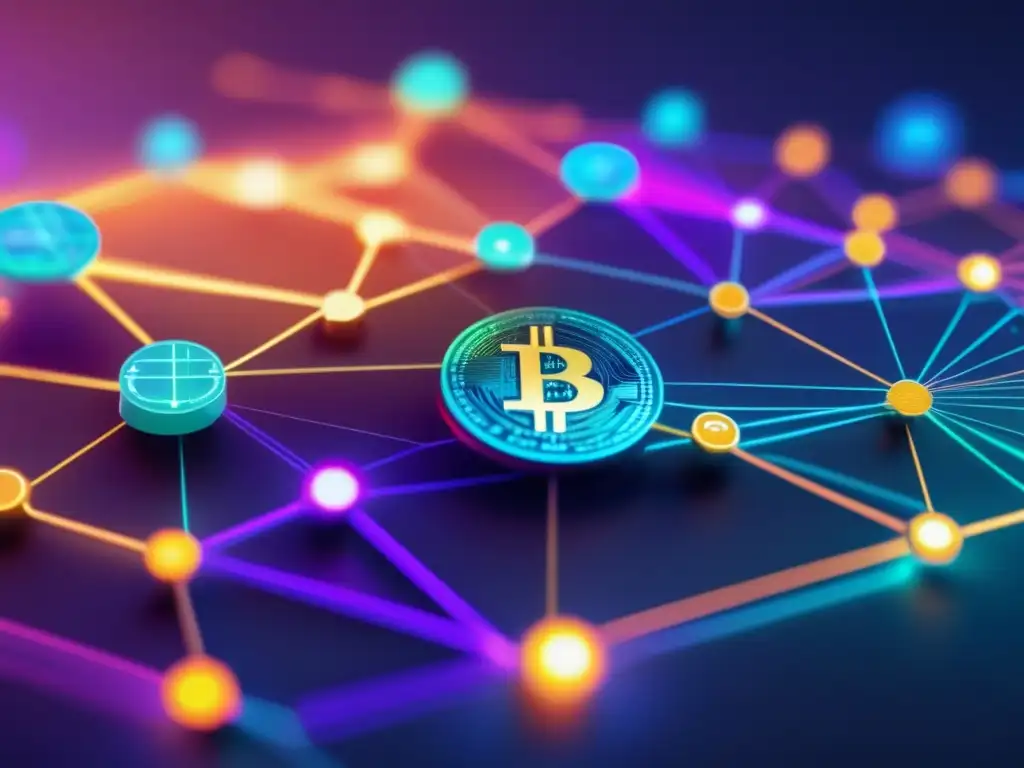 Una red blockchain futurista con nodos brillantes conectados entre sí, rodeada de patrones intrincados