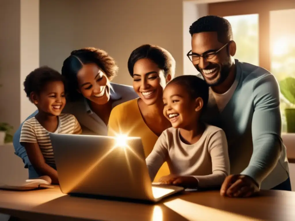 Una familia sonríe al recibir una remesa, bañados por la cálida luz del sol