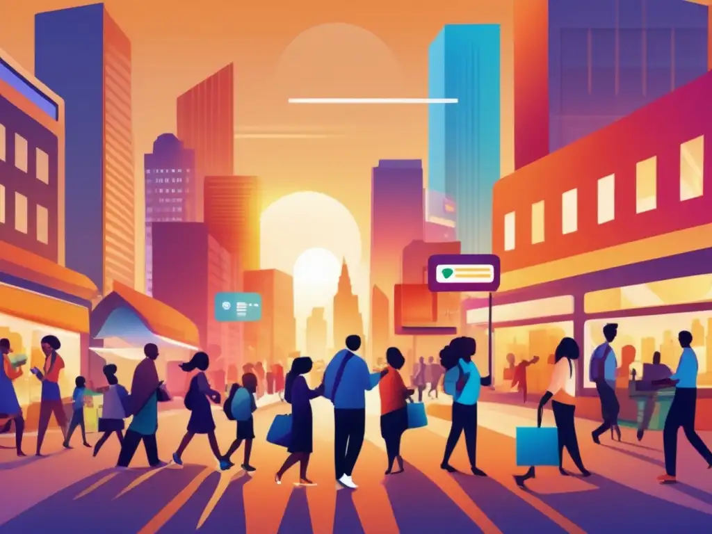 Un grupo diverso de personas de diferentes edades y orígenes intercambian dinero a través de plataformas digitales, en un vibrante paisaje urbano