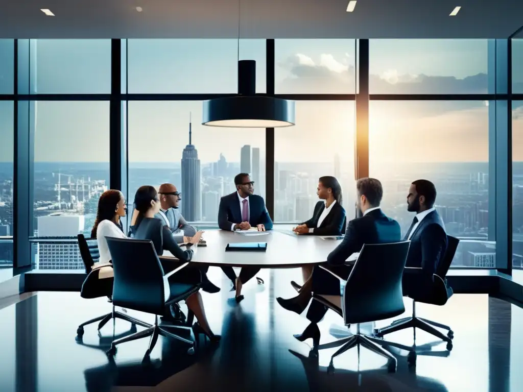 Un equipo de profesionales en trajes de negocios se reúne alrededor de una mesa de conferencias, inmersos en una discusión seria