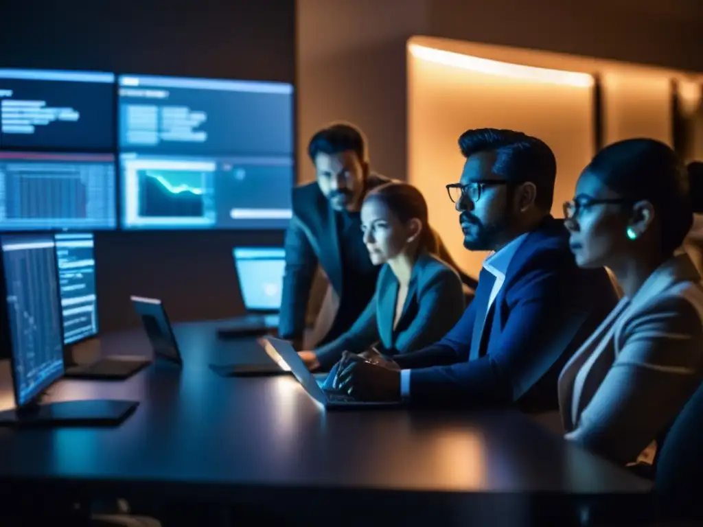 Un equipo de expertos en ciberseguridad analiza datos en múltiples pantallas, discutiendo estrategias para prevenir brechas