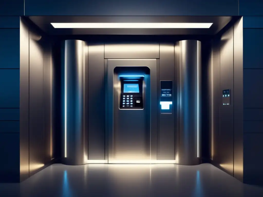 Un imponente y futurista banco con puerta blindada, mecanismos de seguridad y luces azules; protocolos de respuesta bancaria segura