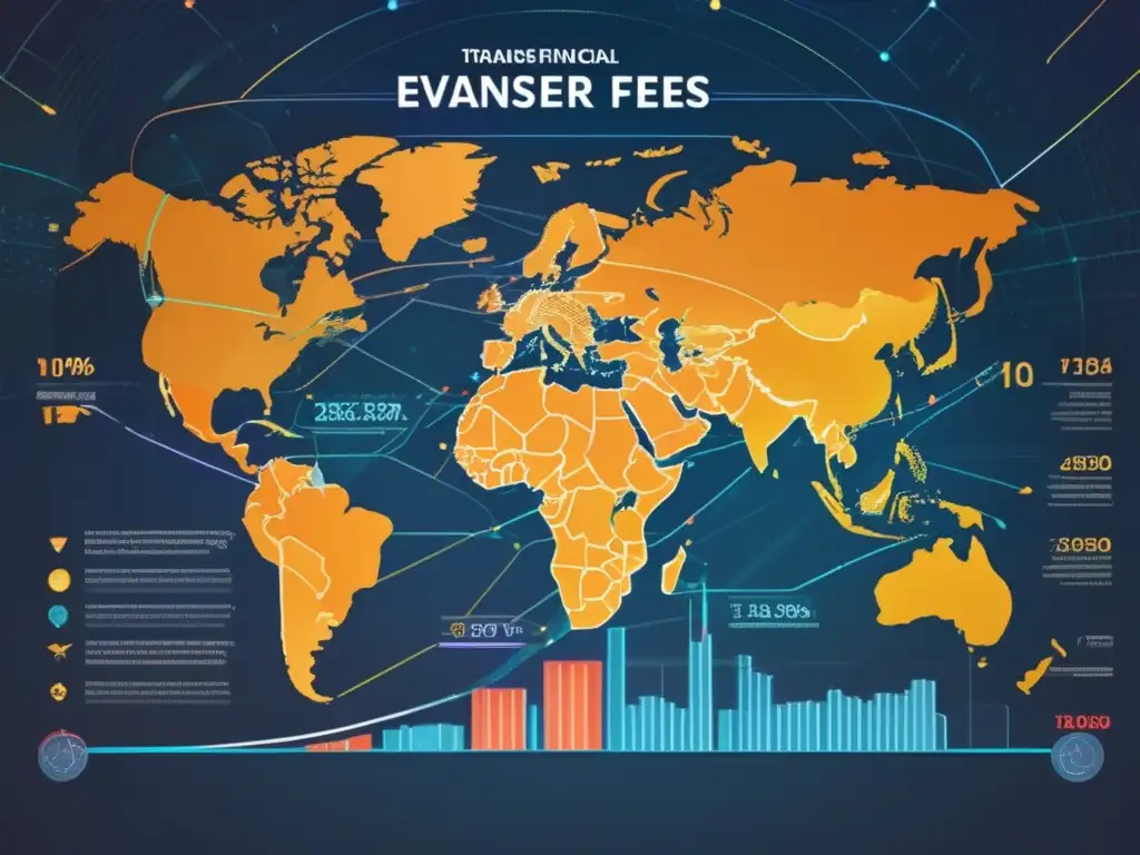Un mapa mundial detallado muestra líneas conectando países, con gráficos que representan tarifas de transferencias