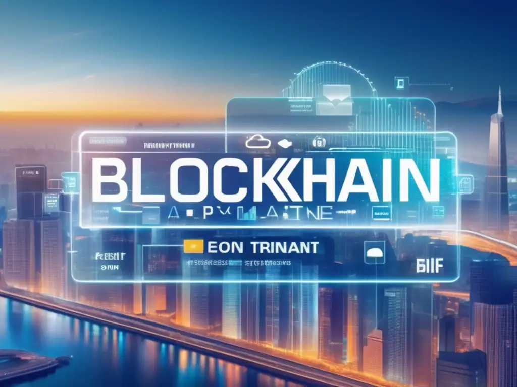Una interfaz futurista de pago digital con soluciones blockchain para microtransferencias, sobre un fondo urbano